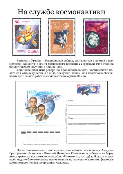 После биологического эксперимента на собаках, космонавты Андриян Григорьевич Николаев и Виталий Иванович Севастьянов работали на борту пилотируемого космического корабля «Союз-9» (1970 год) 17,8 суток и провели медико-биологические исследования по изучению влияния факторов космического полета на организм человека.