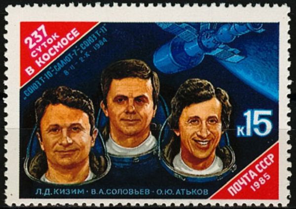 Почтовая марка СССР, посвященная полету в космос космонавтами 3-й основной долговременной экспедиции, которая провела в космосе 237 суток.