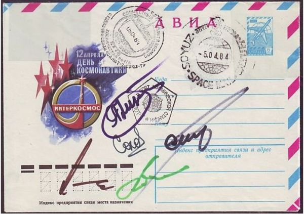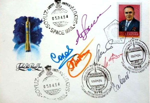 Бортовой конверт с автографами всех космонавтов и с гашением «-5.04.84.» на индийском штемпеле космической почты. Из коллекции автора.