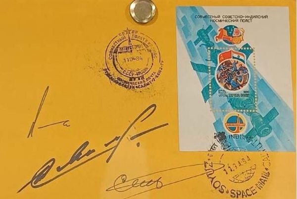 Памятное гашение подлинными штемпелями космической почты СССР и Индии, сделанное на космодроме Байконур с датами приземления «11.04.84» и автографами космонавтов Ю. Малышева, Г. Стрекалова и Р. Шарма.