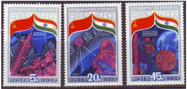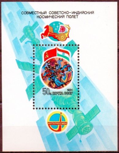 Говоря о филателии советско-индийского полёта следует упомянуть о почтовых марках Индии, ему посвященных. Почтовое ведомство страны, готовясь к предстоящему полёту, планировало выпустить две марки. Первая марка, с изображением орбитального комплекса «Союз-Салют-Союз», была выпущена номиналом 3 рупии.