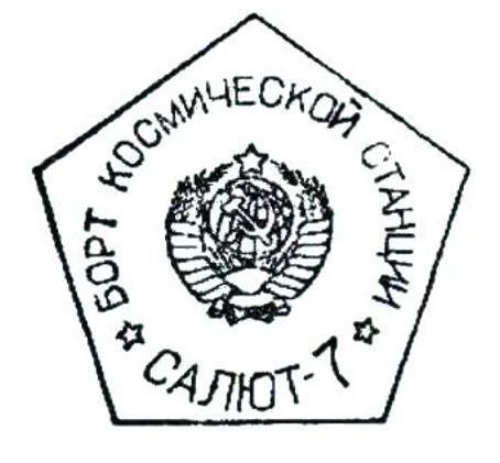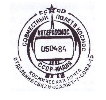 Экспедиция посещения СССР-Индия доставила на станцию почтовый штемпель СССР с переводной датой и текстом по окружности «СОВМЕСТНЫЙ ПОЛЕТ В КОСМОС. СССР-ИНДИЯ. ИНТЕРКОСМОС. КОСМИЧЕСКАЯ ПОЧТА. ОТДЕЛЕНИЕ СВЯЗИ «САЛЮТ-7-СОЮЗ-Т». На рисунке условное изображение стартующей ракеты на фоне орбиты.