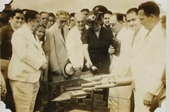 На фото изображен момент, когда Тете Риверо де Ферран, жена прокурора Гаваны доктора Рене Феррана, приступила к инаугурации этого нового почтового процесса доставки писем ракетой.