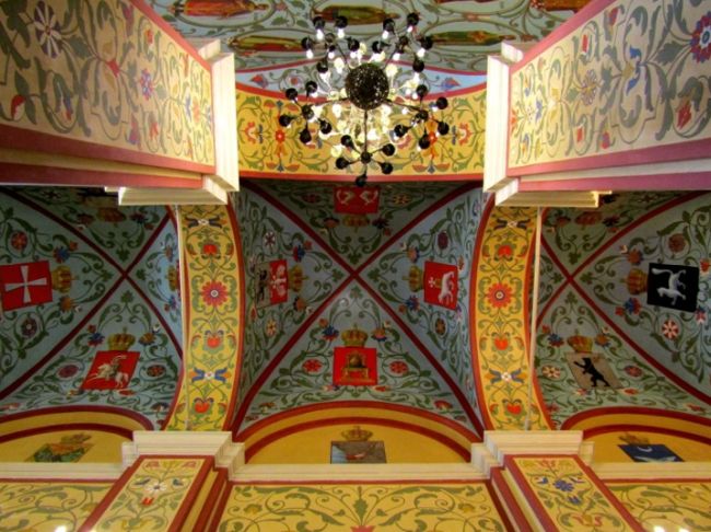 Особенно обворожительны парадные сени Исторического музея, потолок которых украшен генеалогическим древом царствовавшей династии. В боковых нефах на сводах размещены гербы старинных городов Российской империи.