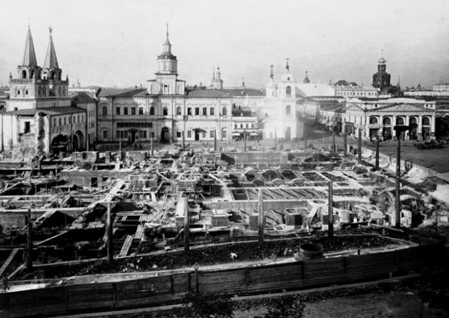 Чёрно-белые фотографии 1875–1876 годов показывают цокольный этаж строительства музея. Воскресенские ворота, воспринимавшиеся современниками как единый ансамбль с музейным зданием, доминируют на обоих снимках. Если бы на первом из них не было здания Богоявленской церкви в одноимённом переулке, а на втором — здания Большого театра, которое выдаёт только квадрига Аполлона на нижнем фронтоне, окружающий пейзаж вряд ли бы отличался особой узнаваемостью.