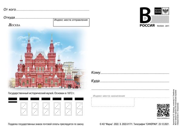 25 января 2022 года в оформлении С. Капранова поступила в обращение почтовая карточка с литерой «В» № 2022-017/1 «Москва. Государственный исторический музей. Основан в 1872 г.». Следует обязательно упомянуть верного помощника и соратника Владимира Осиповича Шервуда в работе над обликом Исторического музея — военного строителя и архитектора, действительного статского советника Анатолия Александровича Семёнова.