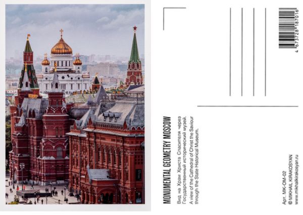 Открытка «Вид на Храм Христа Спасителя через Государственный Исторический музей» ISBN: арт.мк-ом-02,10391 явно была сделана на основе зеркального изображения. В этом можно убедиться, стоя на площади Революции, уже знакомой нам по одноименной станции Московского метрополитена.