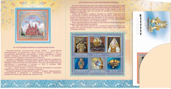 Этот же фасад демонстрирует и почтовый блок №2869 «150 лет Государственному историческому музею», который к 9 февраля 2022 года подготовила художник-дизайнер О. Савина. В этот год праздновался полуторавековой юбилей со дня основания музея согласно решению российского императора Александра II. Ещё 3 года ушло на проведение конкурса проектов музейного здания и утверждение проекта-победителя. И поэтому только сегодня мы празднуем полтора века со дня закладки первого камня всемирно известного здания.