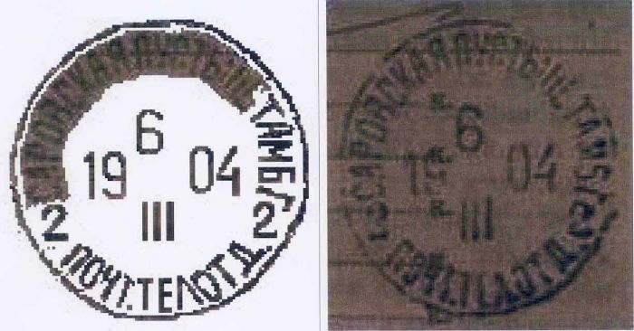 На рис. 1 показан первый оттиск, приведенный Флоренскими, из коллекции географа и историка П.М. Шульгина от 9 июня 1904 года. Как видим, штемпелем была погашена марка Российской империи (оттиск малоразборчив). А слева, как станет ясно ниже, приведена лишь додуманная реставрация этого оттиска. Читаем по окружности: «почт. тел. конт. 2 саровская пустынь. тамб.», что должно означать: «штемпель с порядковым номером «2» почтово-телеграфной конторы в поселке при монастыре Саровская пустынь».