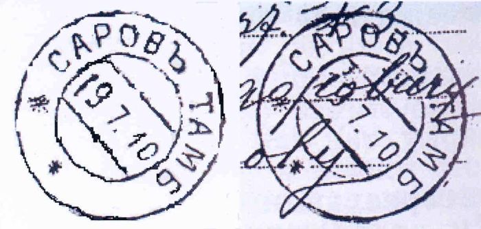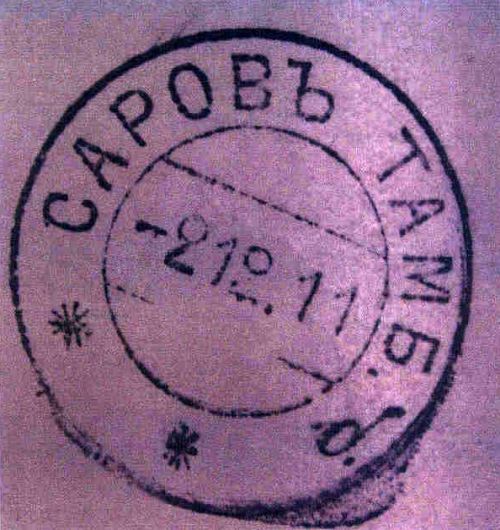 Настораживает отсутствие на оттиске обязательной литеры (буквы), по которой определяется количество действующих в отделении штемпелей. Надпись расшифровывается так: «Почтовое отделение поселка Саров Тамбовской губернии Российской империи». Заметим, что к 1910 году отделение перестало быть телеграфным, и в Сарове стал использоваться штемпель нового образца со строчной календарной датой.