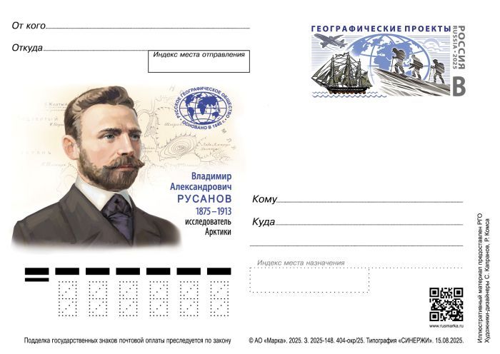 15 ноября в рамках серии «Географические проекты России» в почтовое обращение вышла карточка с оригинальной маркой, посвящённая 150-летию со дня рождения исследователя Арктики Владимира Александровича Русанова.