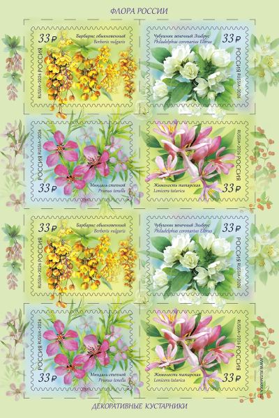 31 марта в рамках серии «Флора России» в почтовое обращение вышли четыре марки, посвящённые декоративным кустарникам.